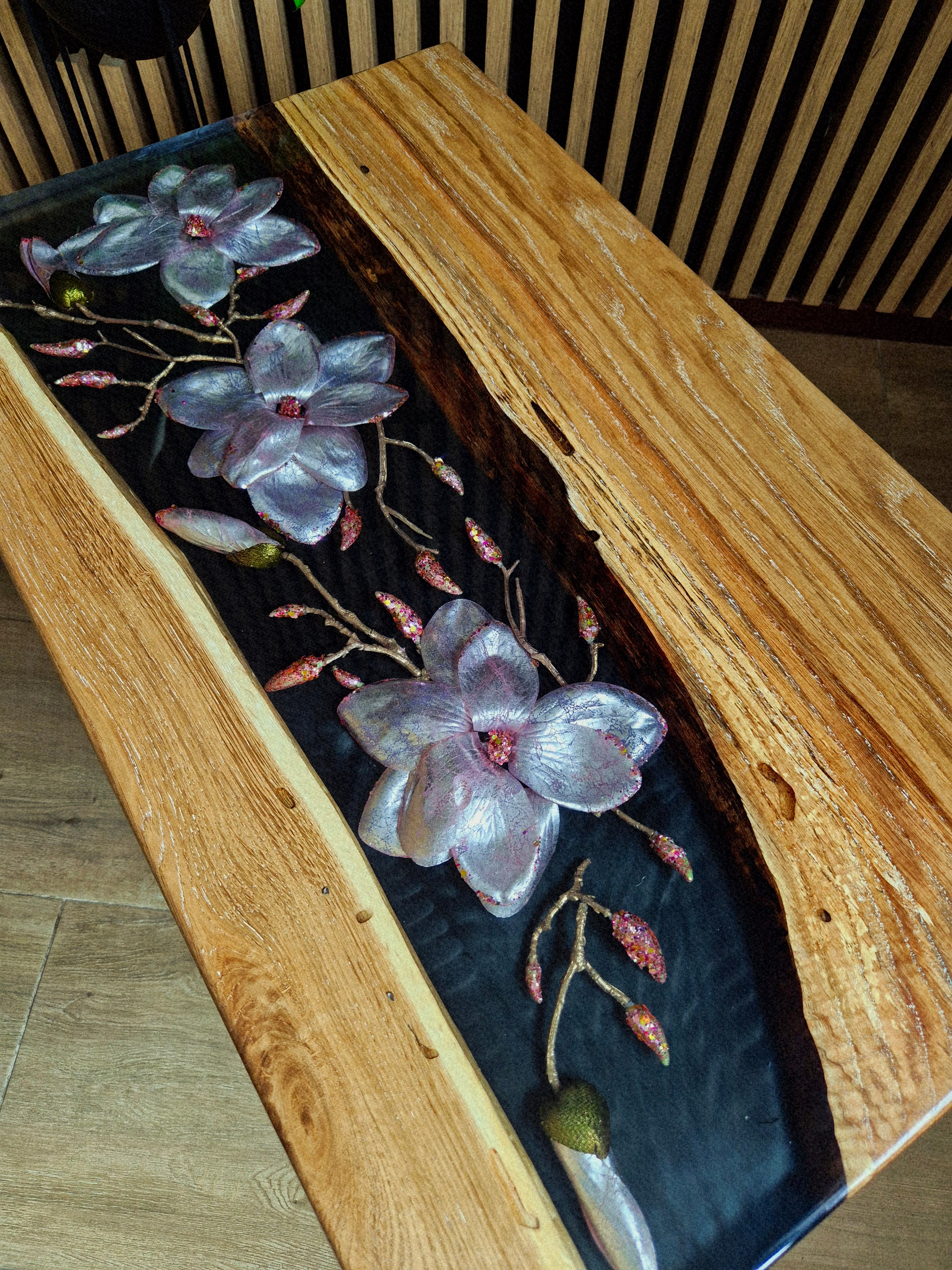 Stolik z żywicy i drewna z kwiatami magnolii – ręcznie wykonany